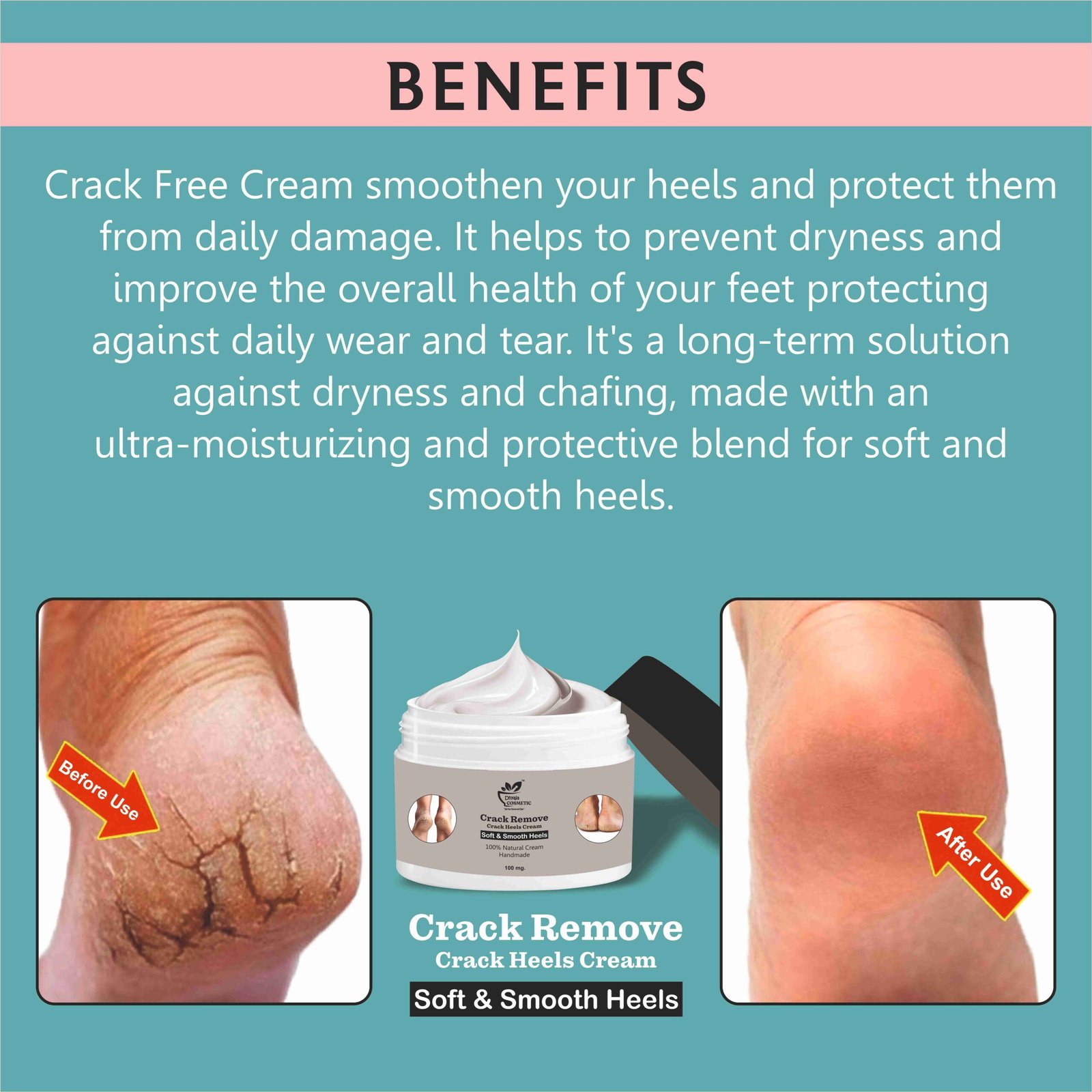 Clean and dry your feet. Apply a sufficient amount of cream to cracked areas and gently massage until absorbed. Use daily, preferably at night, for best results.