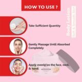 Take a sufficient amount of body lotion and gently massage it all over your body until fully absorbed. Use daily for best results, especially after bathing.